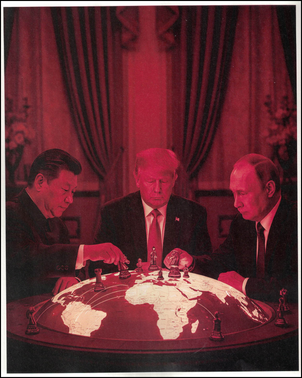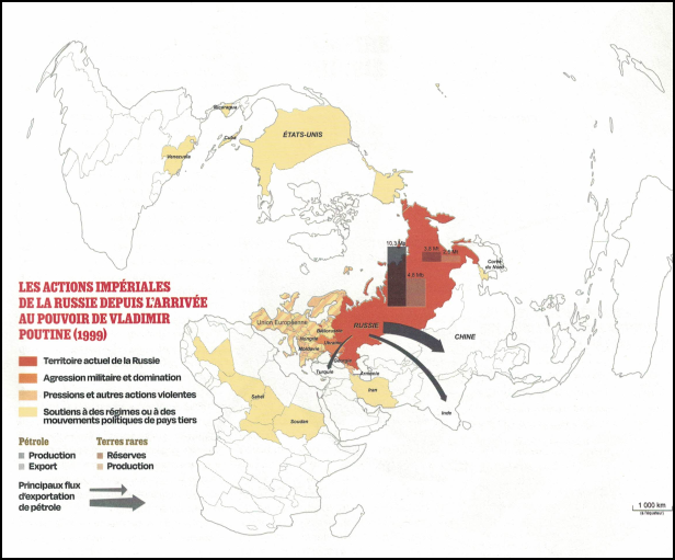 ? - L'Empire russe avec Vladimir Poutine à sa tête depuis 1999 jusqu'en 2036. Une doctrine conservatrice héritée du courant des slavophiles avec le regard tourné vers le passé mythifié de l'URSS dont il considère la dissolution comme la plus grande catastrophe géopolitique du XXème siècle. Opposé aux occidentalistes, il reste marqué par ses fonctions au KGB, n'a jamais adhéré au libéralisme ni à la démocratie pluraliste. Pour lui, l'Occident est jugé décadent en méprisant le droit international dans un régime structuré en verticale du pouvoir par la mise au pas des médias et de la neutralisation de l'opposition par la menace, les emprisonnements ou les assassinats comme Empire atlantiste en se foutant du mandat d'arrêt de la Cour Pénale Internationale pour sa participation à des crimes de guerre en Ukraine. Par une idéologie de vision impériale messianique, il espère être rappelé à redevenir le centre d'un ordre multipolaire. Avec une allusion faisant de Moscou la Troisième Rome, il veut incarner une forme supérieure dans une mission spirituelle et politique universelle. Poutine, grand vainqueur du chaos généré par le déclenchement de la guerre de Trump en Iran. Il a perdu un allié mais a gagné des avantages stratégiques fondés sur la « force brute » et non pas par des règles en donnant sa légitimité par une justification de son action en Ukraine et en fracturant l'OTAN.