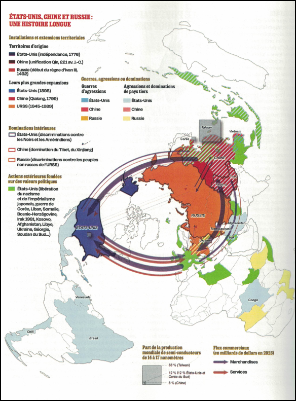 La dynamique de la conquête structure les empires américain, chinois et russe par des voies diamétralement opposées : la loi du plus fort dans un relais impérialiste de la finitude et la relation avec la limitation des ressources et l'utopie d'une Sacré croissance infinie dans un réseau de télécommunication monopolistique et politique.